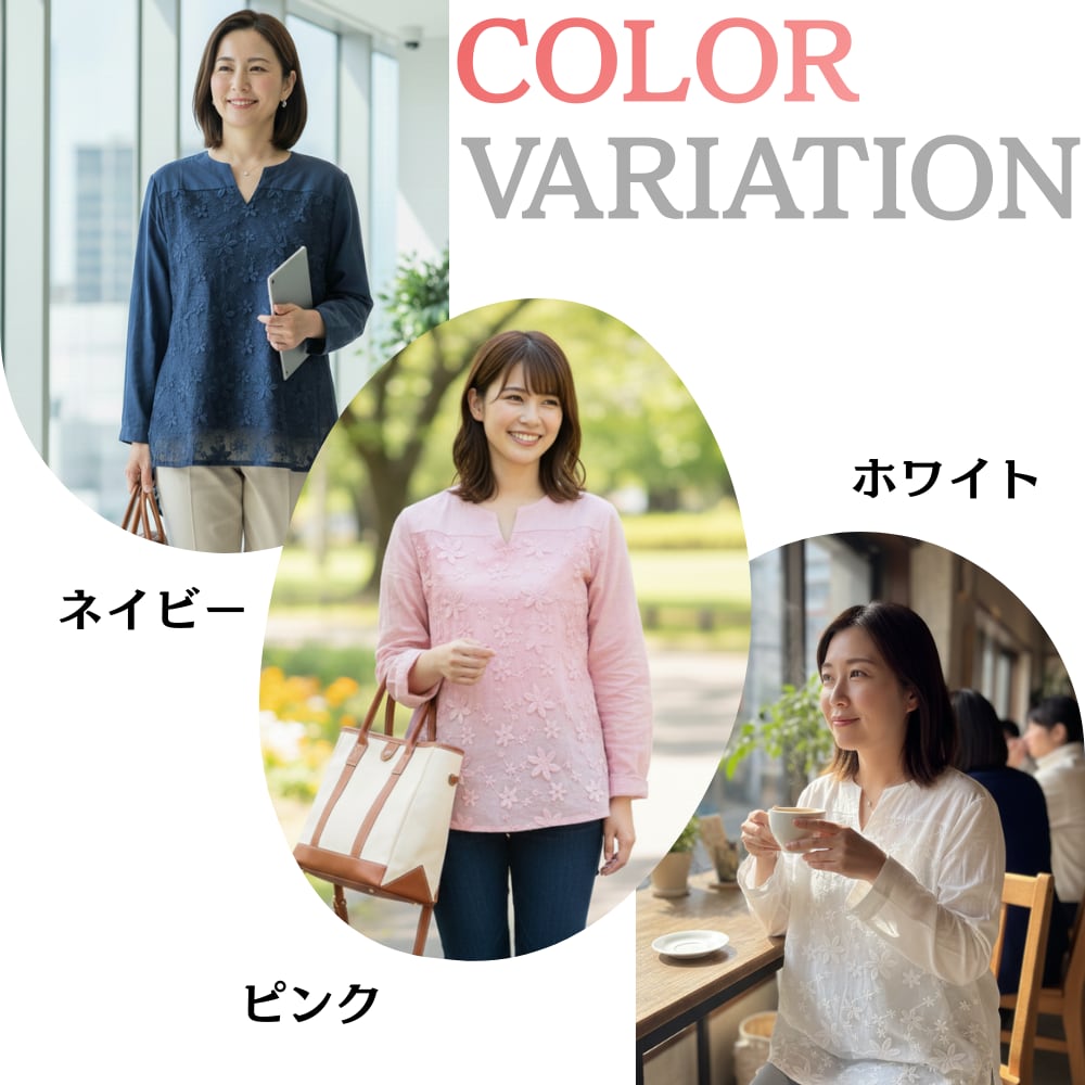 ハレの日のスーツインナーから、休日のリラックススタイルまで。一枚着るだけで顔周りがパッと明るくなる、総刺繍のコットンレースシャツです。「フォーマルな服は堅苦しくて苦手」「化繊のブラウスは肌触りが気になる」という大人の女性のために、綿(コットン)ならではの優しい着心地と、上品なきちんと感を両立させました。