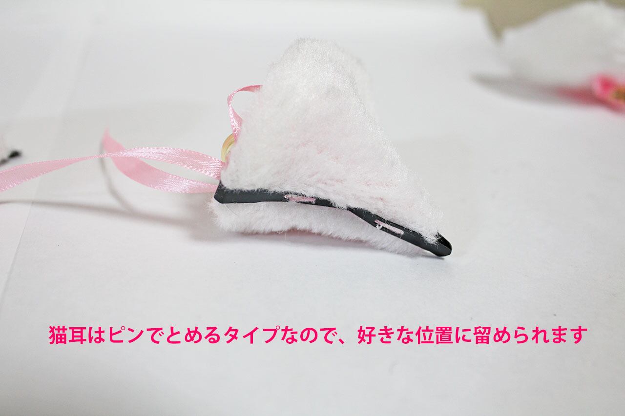猫耳は写真の通りピンでとめるタイプなので、好きな位置に留められます。